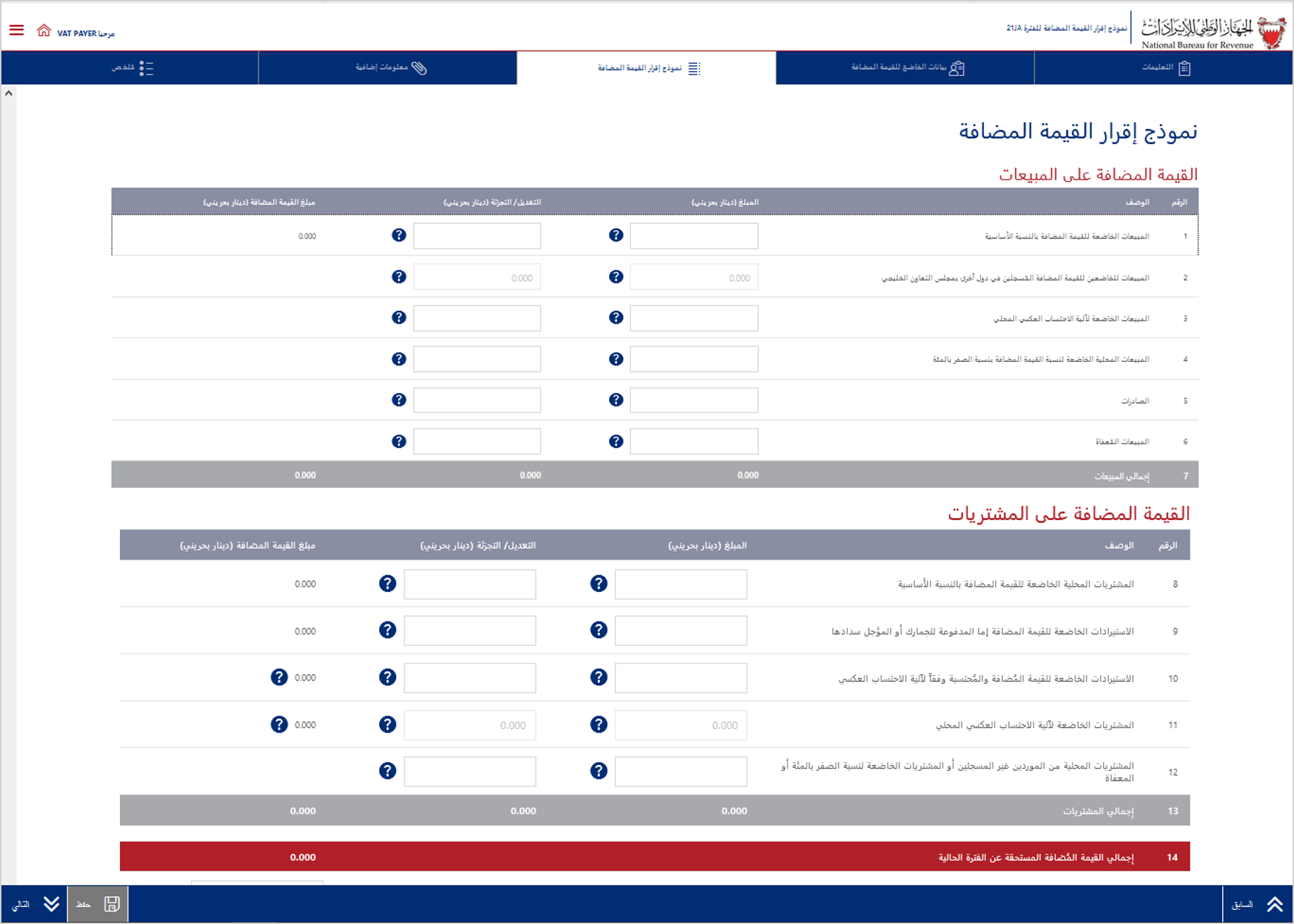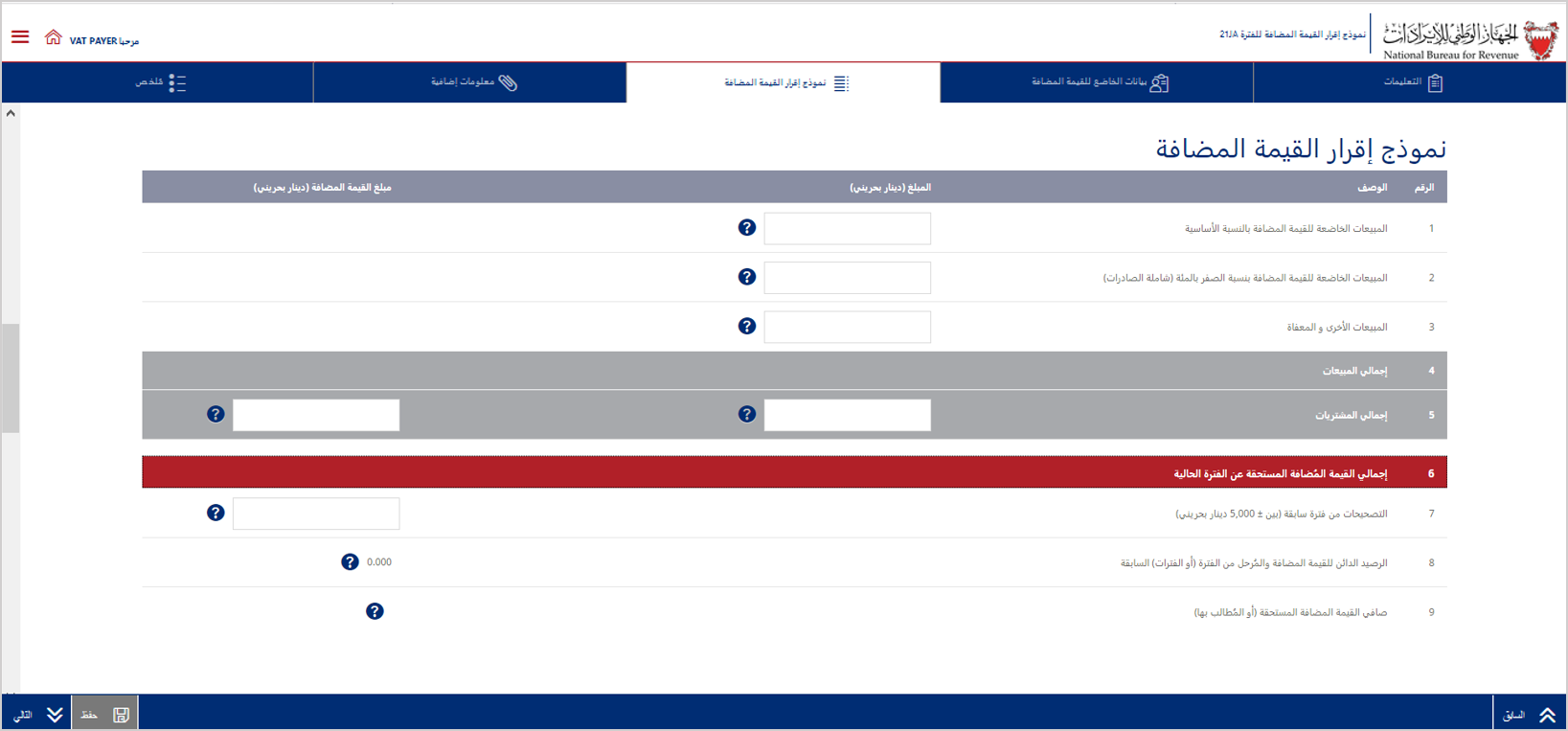 (أ)- المبيعات الخاضعة للقيمة المضافة بالنسبة الأساسية (5%): القيمة الإجمالية (غير شاملة القيمة المضافة) للسلع والخدمات في مملكة البحرين الخاضعة للقيمة المضافة بالنسبة الأساسية 5%، بما في ذلك التوريدات المفترضة وأية تعديلات على مبيعات مماثلة تمت في فترات الإقرار السابقة. يرجى الرجوع إلى الأسئلة الشائعة - قسم الأسئلة العامة للاطلاع على السلع والخدمات الخاضعة للقيمة المضافة بالنسبة الأساسية. تشمل أمثلة التعديلات، إرجاع العملاء للسلع والخدمات التي تم تسجيلها في الإقرارات السابقة وتم سداد القيمة المضافة عنها إلى الجهاز الوطني للإيرادات، شطب الدين المعدوم المتعلق بالتوريدات الخاضعة للقيمة المضافة بالنسبة الأساسية.