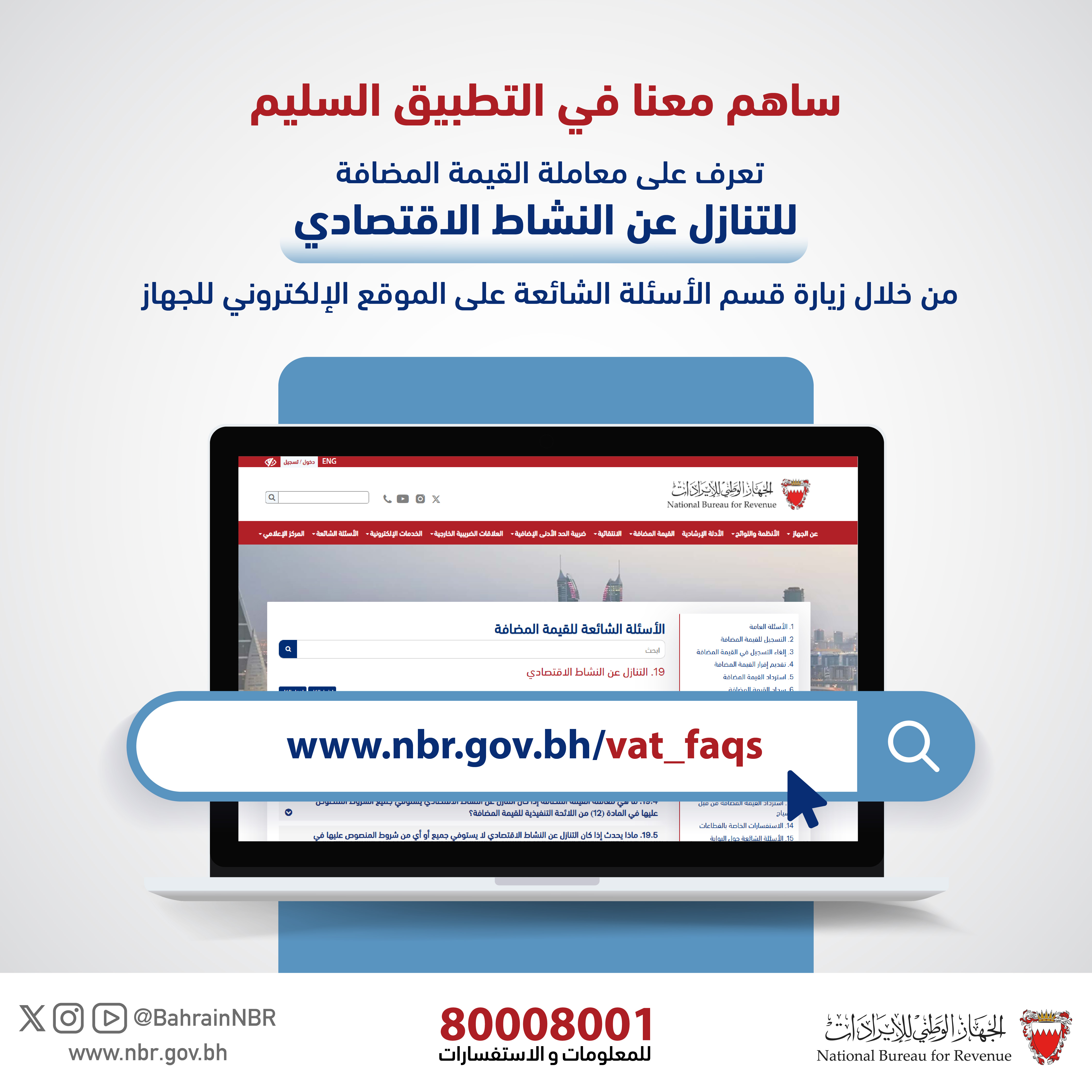 تعرف على معاملة القيمة المضافة للتنازل عن النشاط الاقتصادي من خلال زيارة قسم الأسئلة الشائعة على الموقع الإلكتروني للجهاز.