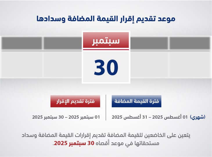 يتعين على الخاضعين للقيمة المضافة تقديم إقرارات القيمة المضافة وسداد مستحقاتها في موعد أقصاه 30 سبتمبر 2025