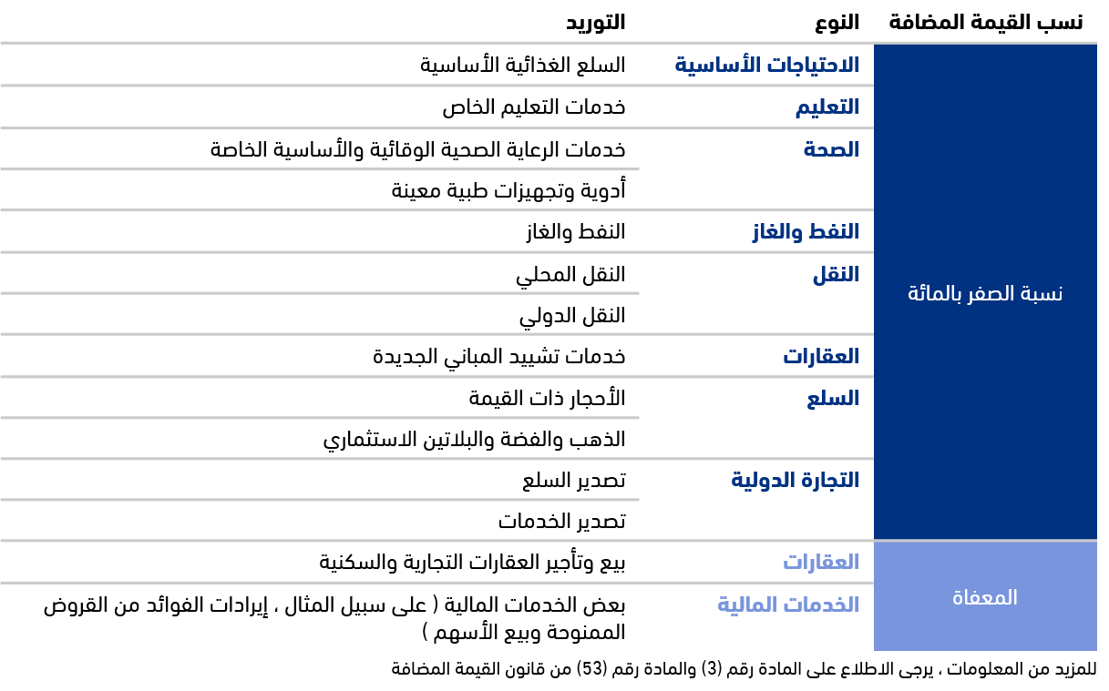 للمزيد من المعلومات يرجى الاطلاع على "الاتفاقية الموحدة للقيمة المضافة لدول مجلس التعاون لدول الخليج العربية" (PDF، 0.512 ميغا بايت، 36 صفحة) .