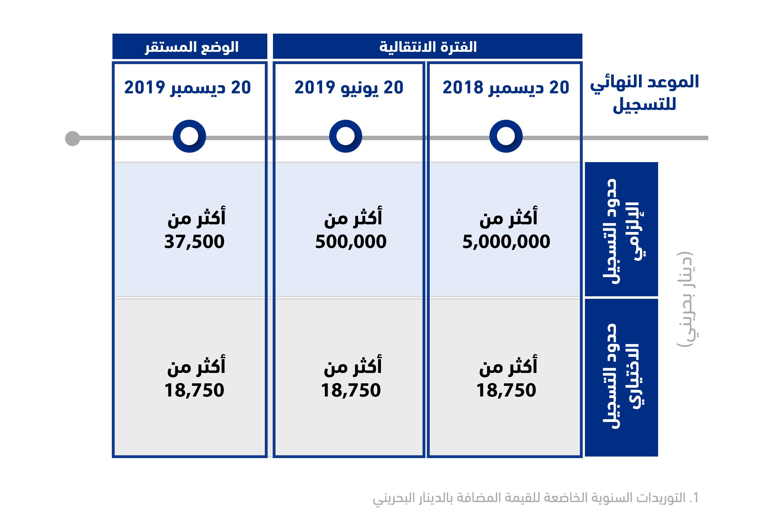 يرجى العلم بأنه يتم تطبيق الفترات الزمنية للتسجيل في المرحلة الانتقالية بناءً على قيمة التوريدات السنوية الخاضعة للقيمة المضافة.