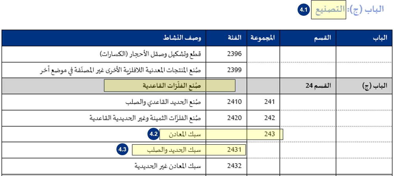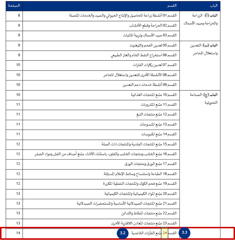 حدد أول رقمين من رمز تصنيف ISIC4 الخاص بك في فهرس الأبواب والأقسام وانقر على الرقم ذي الصلة، سيتم توجيهك إلى القسم المقابل لذلك التصنيف.