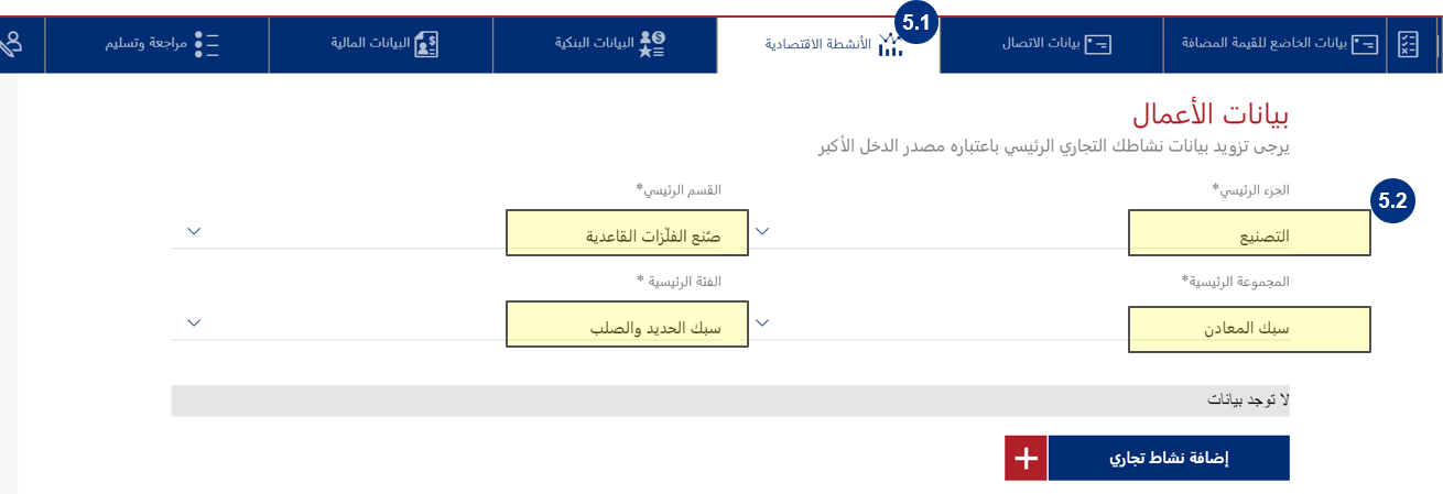 قم بالرجوع إلى قسم "الأنشطة التجارية – بيانات النشاط" في استمارة التسجيل.